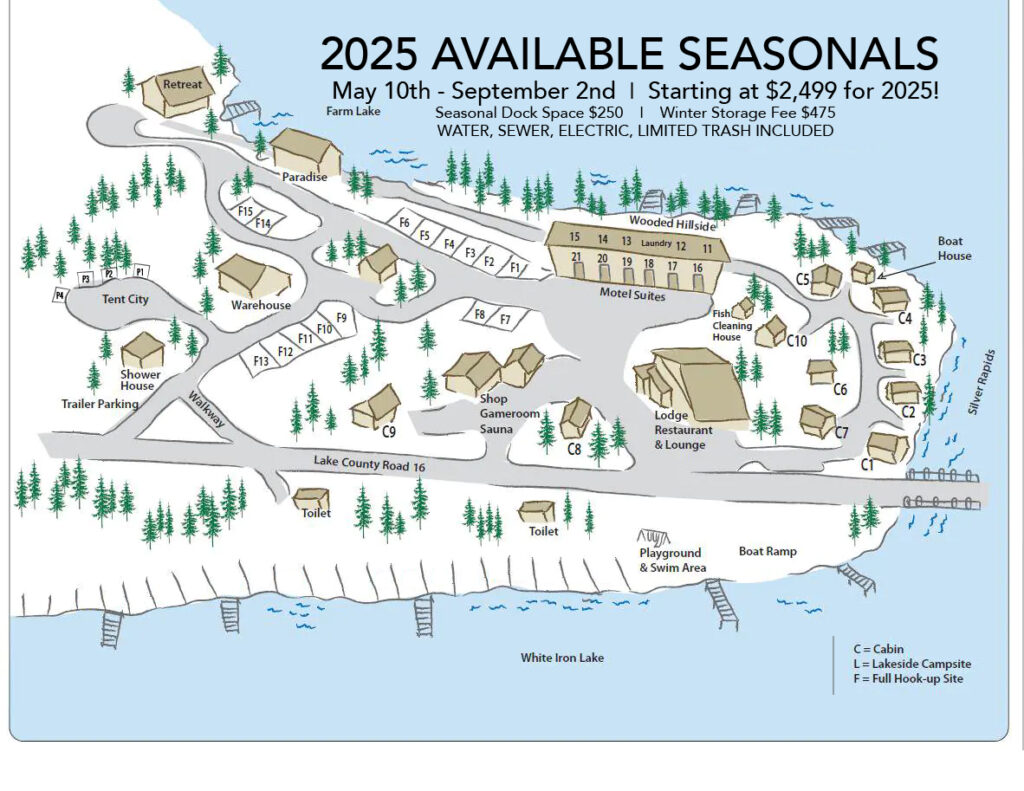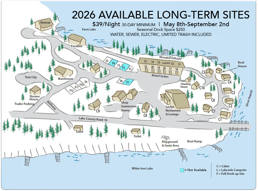 Just outside Ely on the edge of the Boundary Waters, Silver Rapids is located on a vast private peninsula surrounded by White Iron and Farm Lakes, allowing for some of the best fishing around. Access 4 lakes with 20 miles of shoreline from your seasonal site in 2024!